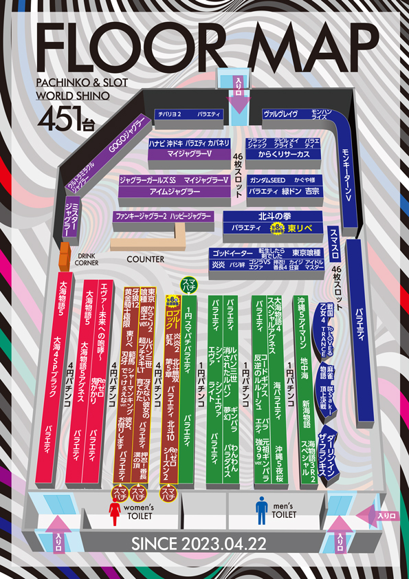 [パチ] 4円:129台 1円:120台 [スロ] 46枚スロ:202台 計451台 |