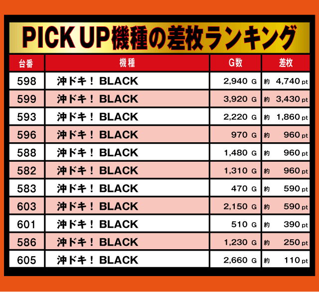 『沖ドキ!BLACK』からは優秀台が誕生。+4,000pt超のほか+3,000pt超もあらわれ、終日活気に満ちあふれていた。