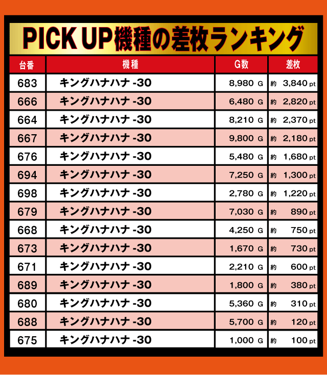 『キングハナハナ-30』も4桁プラスptの台が多数うまれていて、実力を発揮していたようだ。