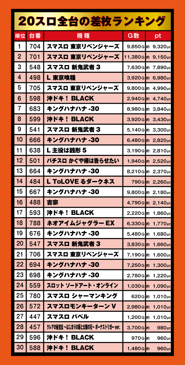 とくに輝いていたのは『スマスロ 東京リベンジャーズ』。704番台が+9,320pt、701番台が+9,150ptを達成していた。そして『スマスロ 新鬼武者3』548番台が+7,890pt、『L 東京喰種』498番台が+6,980ptなど、優秀台がズラリと並ぶデータとなっていた。