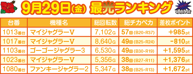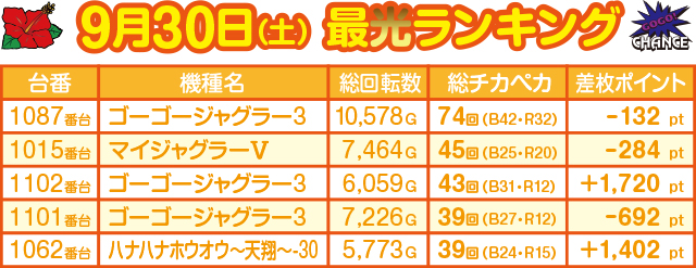 2日目の総チカペカ数の首位に立ったのは『ゴーゴージャグラー3』。前日を大きく上回る合計74ペカリというレコードだった。『ゴーゴージャグラー3』も3台がTOP5に食い込む活躍を見せたものの、この日は『ハナハナホウオウ~天翔~-30』が意地を見せ、5位にランクイン。『ジャグラー』シリーズの独壇場を防ぐ形となった。