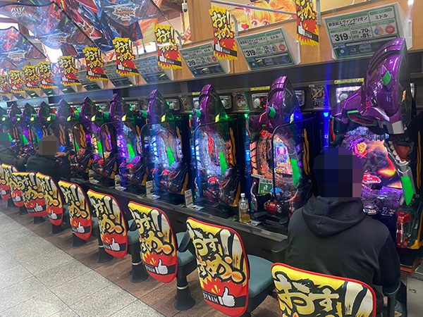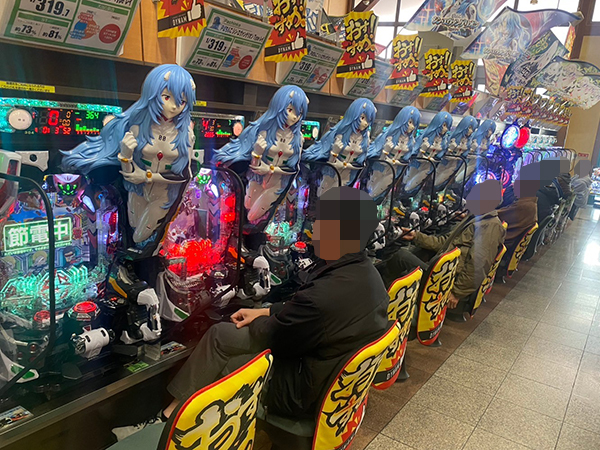 15時ごろの4円パチンコでは「ぱちんこ シン・エヴァンゲリオン Type レイ」や「新世紀エヴァンゲリオン〜未来への咆哮〜」で好調なプレイヤーが多数見受けられ、時折見せる嬉しそうな表情が印象に残っている。