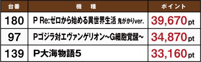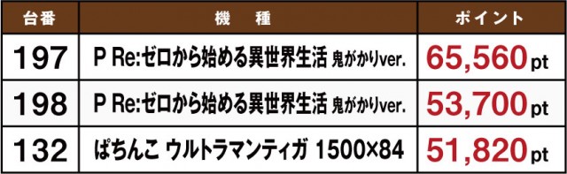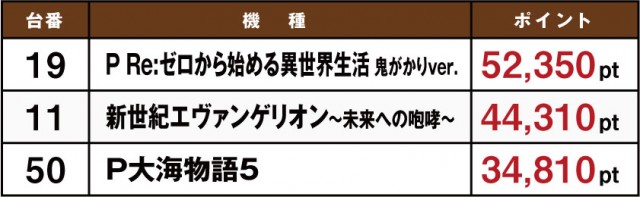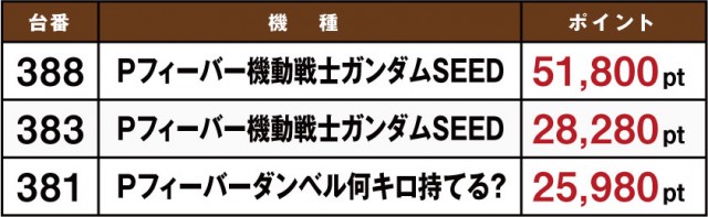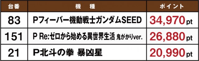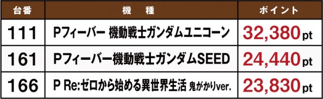 9月15日に実施された「ホームランボール」の模様をお伝えしていこう。先月に引き続き優秀台として挙げられるのが『Pフィーバー機動戦士ガンダムSEED』だ。やはり『ユニコーン』のようにスペック面や人気面で引けを取らないということだろう。また、『P Re:ゼロから始める異世界生活 鬼がかりver.』や『大海物語5』もポイント数が高い台がある。遂に『エヴァ』の牙城を崩す機種が現れたか!? 来月の「ホームランボール」が楽しみだ。