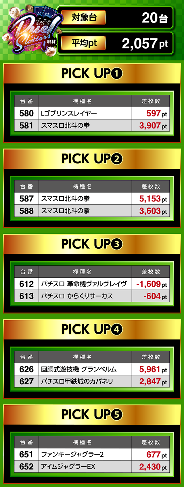 626番台の「回胴式遊技機 グランベルム」は5,900ptを越え、627番台の「パチスロ甲鉄城のカバネリ」も2,800ptオーバー!