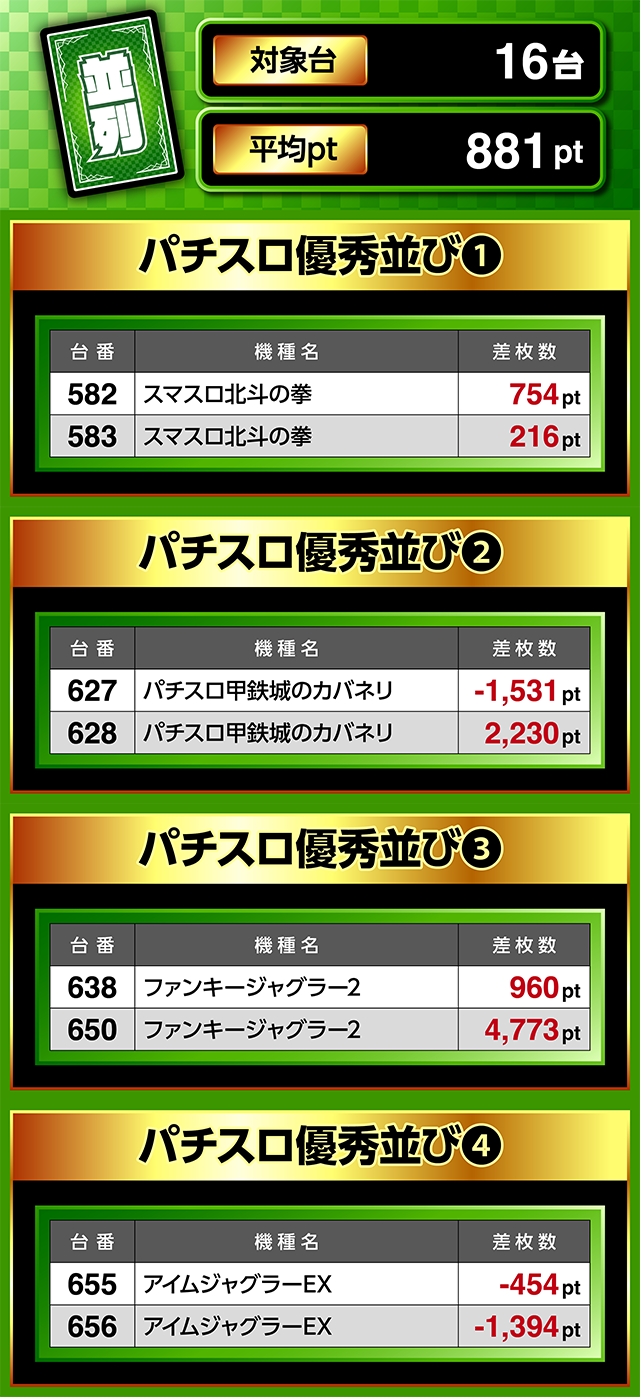 638番台と650番台の「ファンキージャグラー2」にプラスが続き、650番台は4,700ptオーバー!
