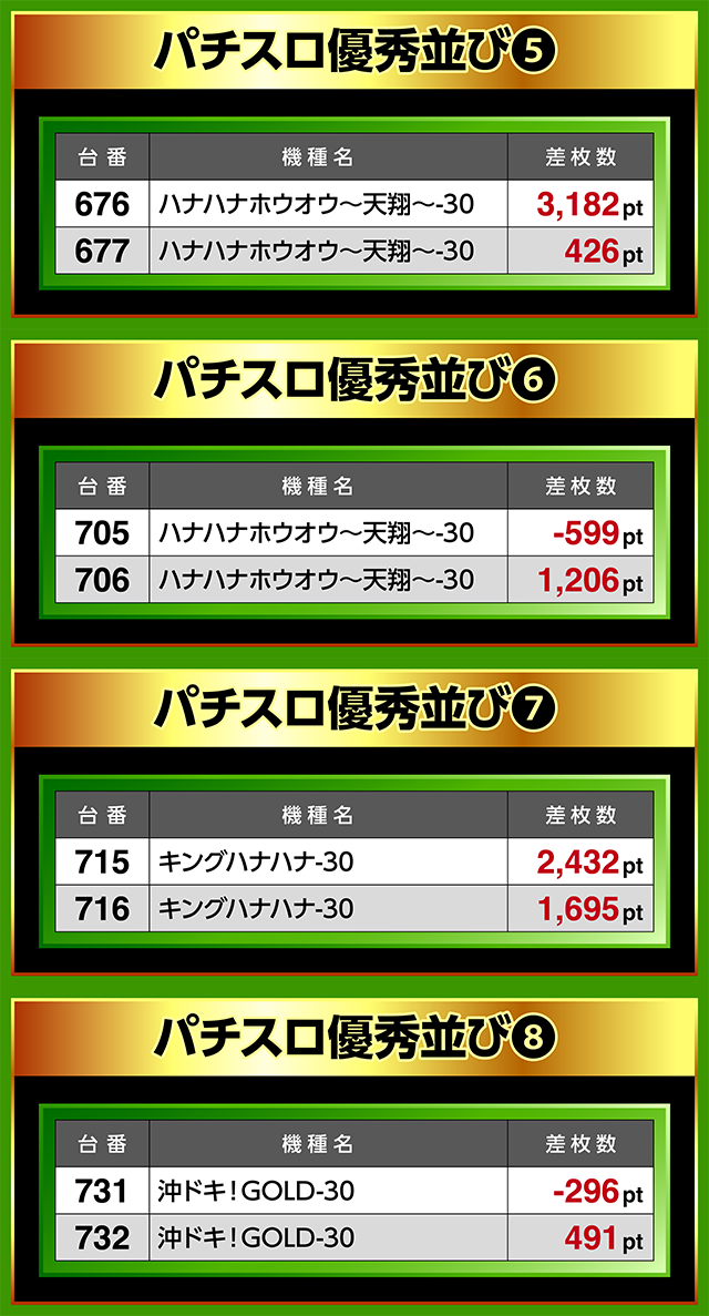 「ハナハナホウオウ~天翔~-30」の並びにも、3,100pt超があった。