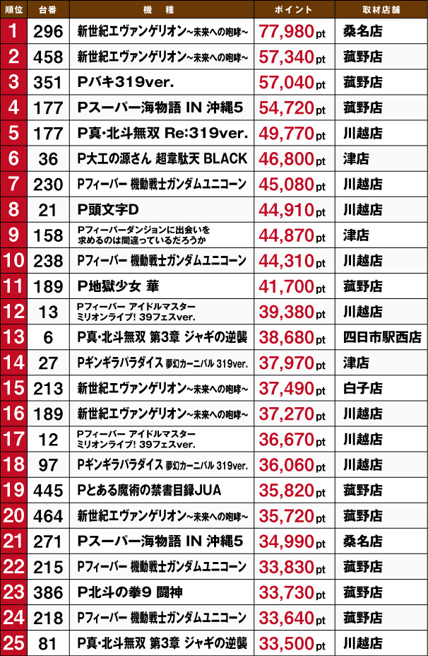 今月は現役人気ナンバー1と言っても過言ではないだろう『新世紀エヴァンゲリオン~未来への咆哮~』から5台の優秀台が飛び出てきた。また、『Pフィーバー 機動戦士ガンダムユニコーン』も根強い人気を誇る機種。こちらも4台の優秀台が確認できている。そんな中、『Pフィーバーダンジョンに出会いを求めるのは間違っているだろうか』『Pフィーバー アイドルマスター ミリオンライブ! 39フェスver.』などの新機種からも優秀台が出てきており、まさにSANKYOの機種が席巻してきているような状況だ。今後の狙い目としてチョイスするのもありだろう。