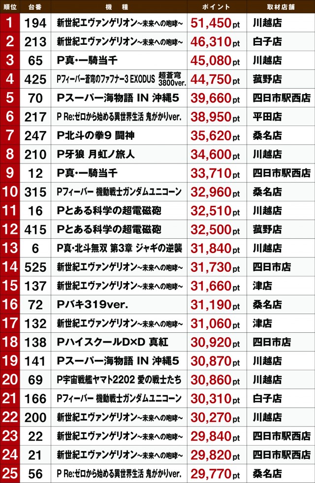 今月はやはり今をときめく一番人気の『新世紀エヴァンゲリオン~未来への咆哮~』が各店舗で優秀台として複数台ピックアップされてはいるが、それだけではなく各店舗のTOP台が多種多彩となっている。例えば、菰野(こもの)店は『Pフィーバー蒼穹のファフナー3 EXODUS 超蒼穹3800ver.』、四日市駅西店は『Pスーパー海物語 IN 沖縄5』、平田店は『P Re:ゼロから始める異世界生活 鬼がかりver.』がTOP差玉となるなど各店舗がエヴァ以外にも力を入れているのが垣間見える。プレイされる際はエヴァ以外の選択肢というのも視野に入れてみるといいだろう。