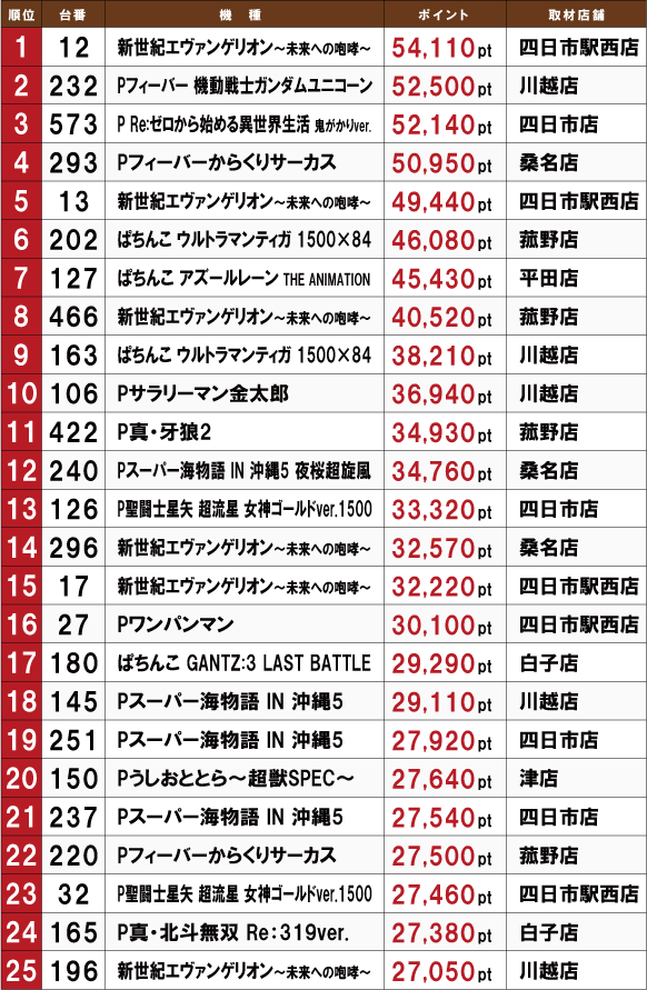 毎月15日に三重ホームラングループ8店舗を同時取材する「ホームランボール」。今月の結果をお伝えしよう。人気定番機種である『新世紀エヴァンゲリオン~未来への咆哮~』は今月もなんと6台が優秀台に! ただ、それ以外の機種は多彩になっており、新機種が比較的ポイント数が高い結果となった。『ぱちんこ ウルトラマンティガ 1500×84』や『P聖闘士星矢 超流星 女神ゴールドver.1500』など著名コンテンツが2台ずつ優秀台となっているので今後の動向に注目だ!