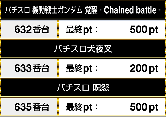 バラエティコーナーでは、632番台の『パチスロ 機動戦士ガンダム 覚醒‐Chained battle‐』から635番台の『パチスロ 呪怨』までが並んでプラスptを記録した。