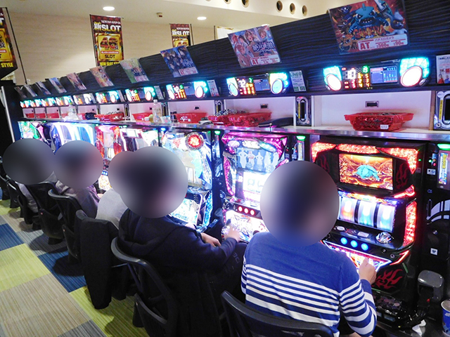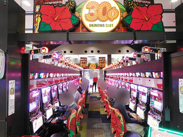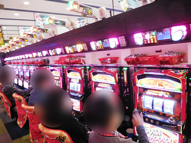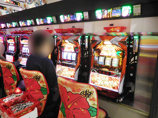 9台設置の『ドリームハナハナ-30』には複数箱のメダル積みがズラリと並び、6台設置の『プレミアムハナハナ-30』には後ろ積みが生まれる盛り上がった状況に。『沖ドキ!2-30』も出率100%超えの好調ぶりを見せ、沖スロ全体の盛り上がりが見事だった! また、『麻雀格闘倶楽部参』から『絶対衝激Ⅲ』までの並びには、リアルモンスタークロスの魅力が詰まった状況が展開され、他ではなかなか好調台に出会えない機種を満喫できる状況となっていた。