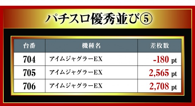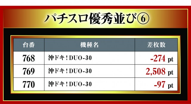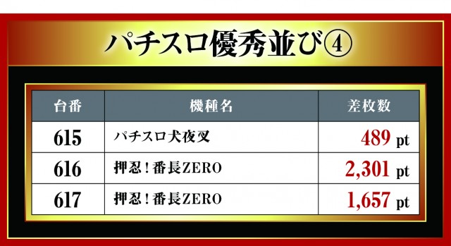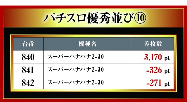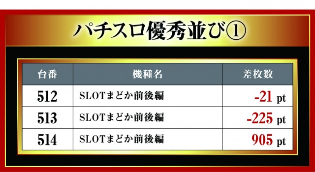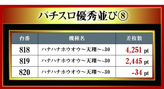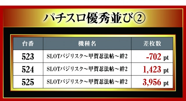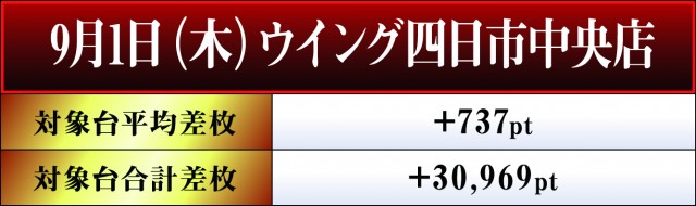 三重北ウイング4店舗を徹底取材する「はねバト!」。9月1日に実施された「四日市中央店」のパチスロコーナーの模様をお伝えしていこう。3台並びでの優秀台ということで、やはり前回に引き続き『ハナハナホウオウ~天翔~-30』が強い! 目立った所でも3箇所ほど確認された。一方、AT機のほうは『SLOTバジリスク~甲賀忍法帖~絆2』などの人気機種に優秀台が…! 先月と見比べて優秀台となった箇所の傾向をしっかりと把握しておこう。今後も毎月1日に実施される本取材に注目だ!