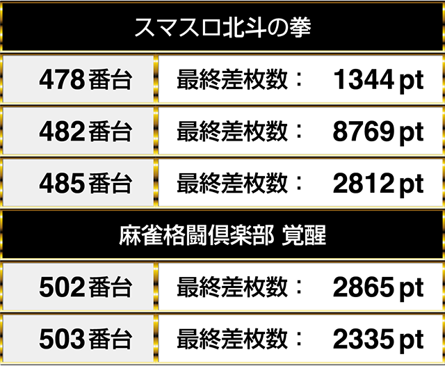 閉店時には3台が1000ptを上回り、514番台は4000pt以上!