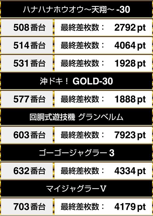 『回胴式遊技機 グランベルム』の603番台は7923ptを記録してこの日を終えた。