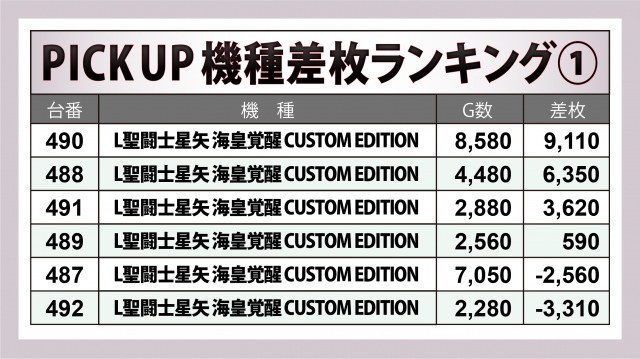 中でも『L聖闘士星矢 海皇覚醒 CUSTOM EDITION』が躍進。+9,100ptオーバーがシマトップとなった他、+6,400pt弱・+3,600pt超が1台ずつと、ハイスコアが連発。
