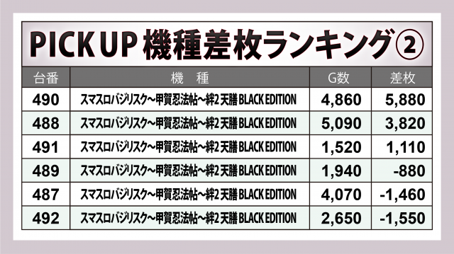 さらに『スマスロバジリスク~甲賀忍法帖~絆2 天膳 BLACK EDITION』では+5,900pt弱&+3,800pt超が1台ずつ、『スマスロ北斗の拳』に+3,300pt弱、『パチスロ甲鉄城のカバネリ』では+2,000pt超が2台と、好況が窺えた。