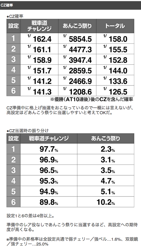 高設定ほどCZの当選率が高く、とくにあんこう祭りの設定差が大きい。