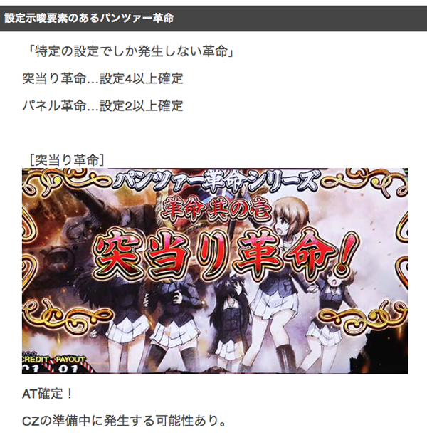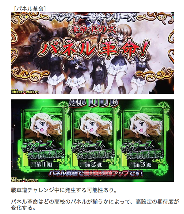 パンツァー革命にも設定示唆があり、CZの準備中に突当り革命が発生すれば設定4以上、戦車道チャレンジ中にパネル革命が発生すれば設定2以上が濃厚だ。