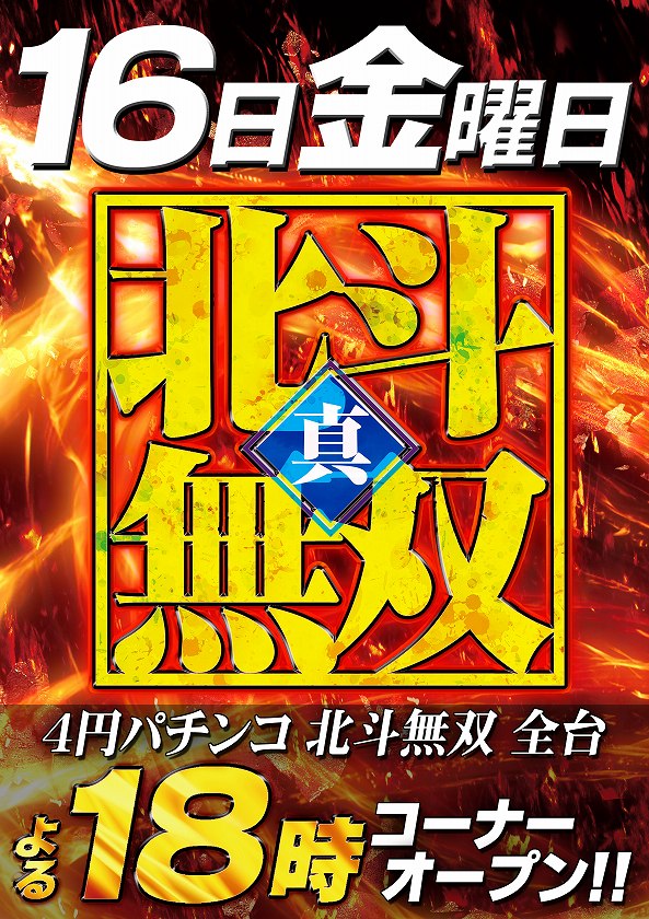 間もなくです!金曜よる18時、北斗無双全台コーナーオープン!