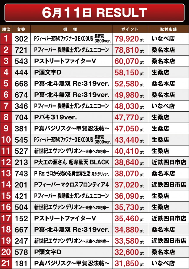 6月1日から始まった王様伝説の2回目の取材が早くも実施された。今回は『Pフィーバー蒼穹のファフナー3 EXODUS 超蒼穹3800ver.』『PストリートファイターV』『P真バジリスク~甲賀忍法帖~』などを筆頭とする今をときめく新台が多数優秀台に! もちろん、『新世紀エヴァンゲリオン~未来への咆哮~』や『Pフィーバー 機動戦士ガンダムユニコーン』などの人気機種からも優秀台が飛び出てくるなど新旧ともに充実したラインナップとなった。今後も北勢4店舗の伝説を見逃すな!