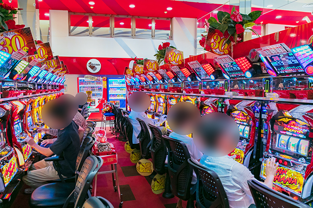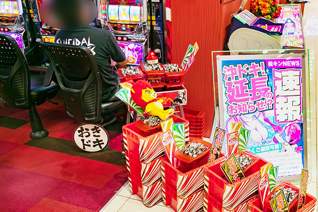 『ハナハナ』シリーズの人気に対し『沖ドキ』が徹底対抗! ソーシャルディスタンスを意識した機種配置の所々にインパクトのあるカチ盛りが生まれていた。