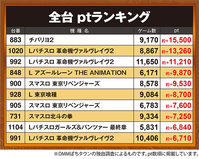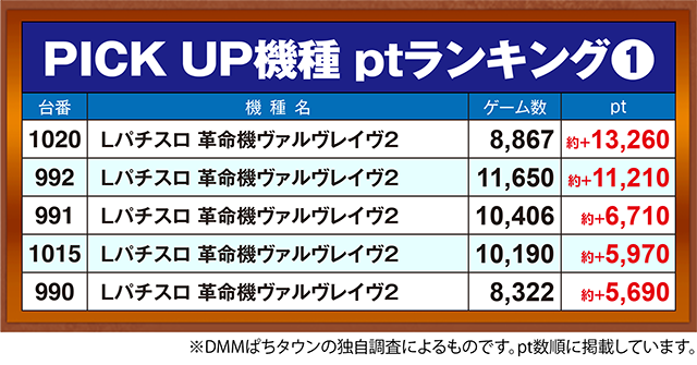 「Lパチスロ 革命機ヴァルヴレイヴ2」は、1020番台と992番台が約+11,000ptを超えた。