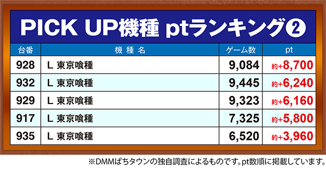 「L 東京喰種」の928番台は約+8,700pt、「スマスロ北斗の拳」の731番台も約+7,250ptと、多くの台が好結果となった。