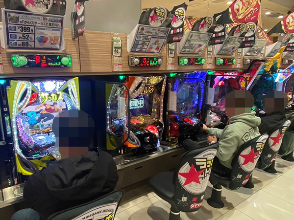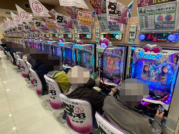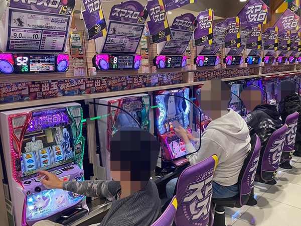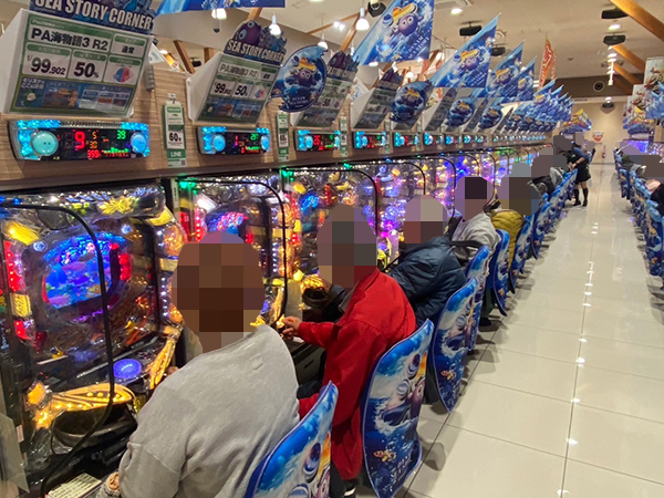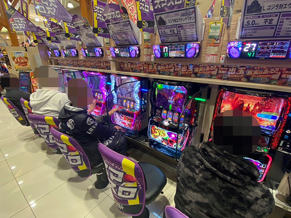 取材時は多くのプレイヤーが来店。パチンコ・パチスロともに、様々な機種が支持を得ていた。