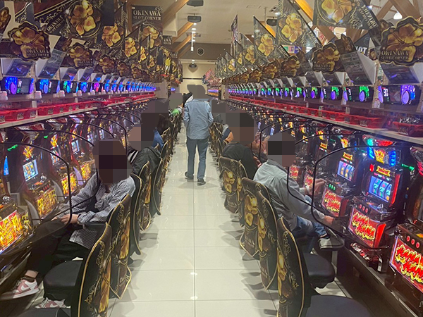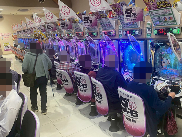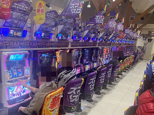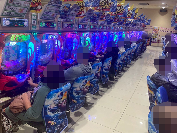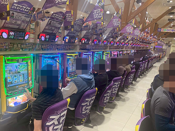 取材時は既に多くのプレイヤーが集結し、パチンコ・パチスロを問わずにぎやかな状況となっていた。