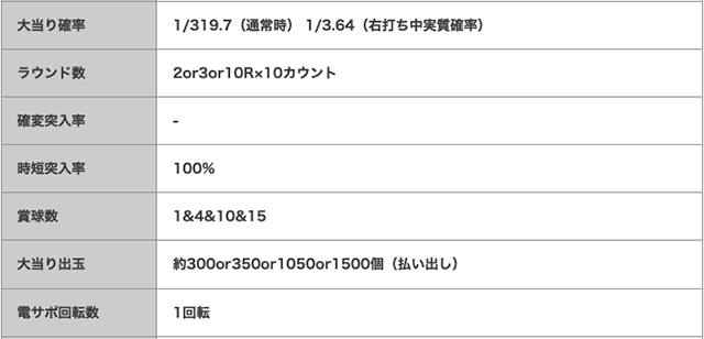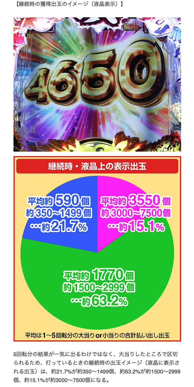 最大で5回転分の大当りを続けて消化し、一撃の最大獲得出玉は7500個(払い出し)となる。