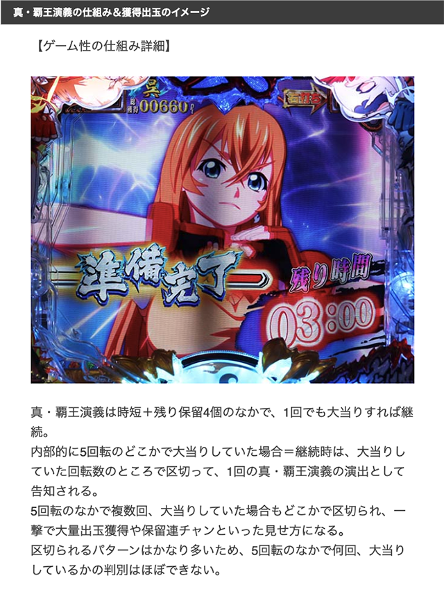 メインの連チャンゾーン「真・覇王演義」の突入率は63%で、継続率は約80%を誇る。