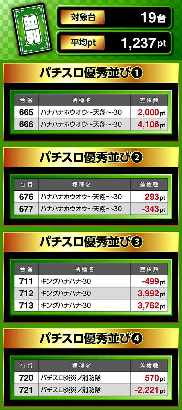 665番台と666番台の「ハナハナホウオウ~天翔~-30」が並んで、2,000ptと4,106ptを記録。