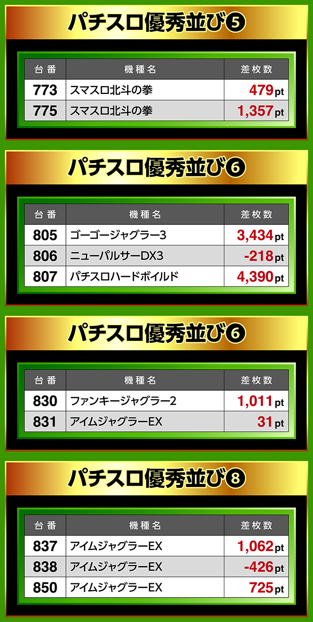805番台から807番台までにも注目台が並び、807番台の「パチスロハードボイルド」が4,300ptオーバー。