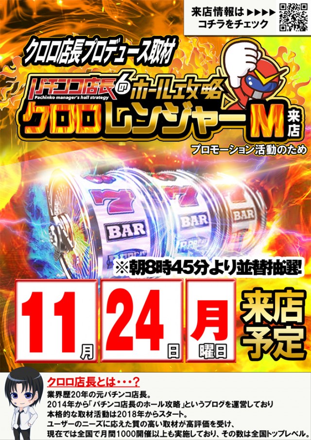 11月24日(月)朝9時開店!クロロレンジャーM来店!!