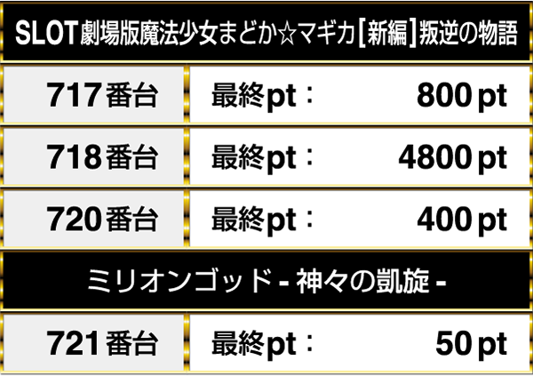 並びで設置された『SLOT劇場版魔法少女まどか☆マギカ[新編]叛逆の物語』と『ミリオンゴッド-神々の凱旋-』は、717番台から721番台までが連なってプラスpt!!