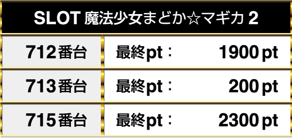 2300ptの台があった『SLOT魔法少女まどか☆マギカ2』は、設置されている3台すべてがプラスptを記録!
