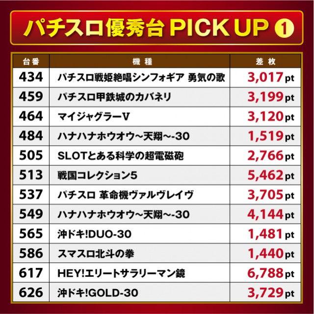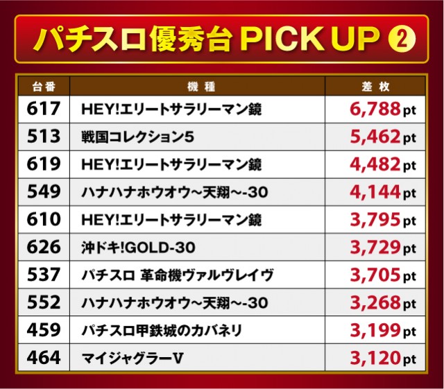 4月7日に実施された『キング観光いなべ店』の王様伝説の模様をお伝えしよう。ピックアップ①は各列の最優秀台、②は全台を対象とした差枚数順での優秀台だ。今月はスマスロ勢と30φが賑わせており、『HEY! エリートサラリーマン鏡』の610番台、617番台、619番台。『パチスロ 革命機ヴァルヴレイヴ』の537番台がしっかりとしたプラス差枚数を見せている。沖スロコーナーも『ハナハナホウオウ~天翔~-30』の549番台、552番台が抜群。高設定ではないと成し得ない差枚数となった。来月あたりは新鋭『キングハナハナ-30』がピックアップされてもおかしくはないか!? GWの最終日に期待しよう。