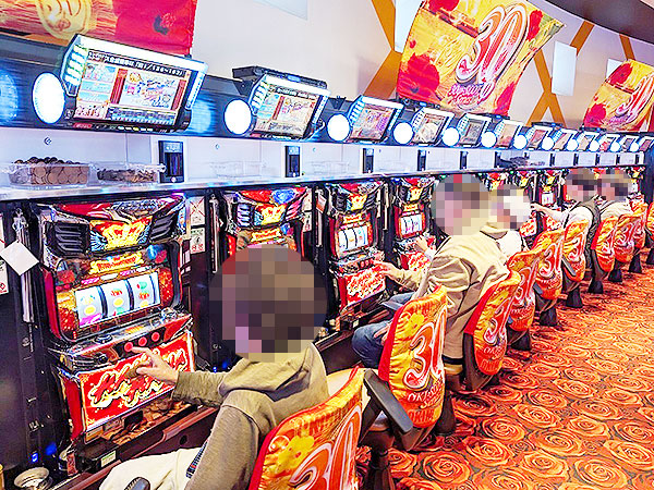 5円パチスロは全体的に高稼働。空き台が見当たらないほどの盛況ぶりだった。