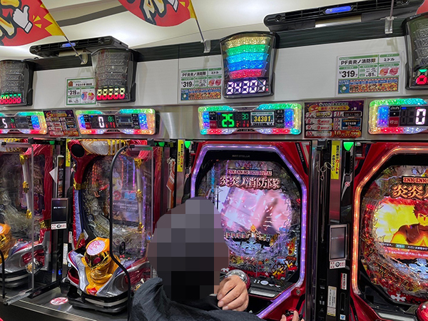 14時ごろの4円パチンコの様子を見ると「P魔法少女まどか☆マギカ3」や「Pフィーバー炎炎ノ消防隊」が大盛り上がり。機種性能を存分に発揮するプレイヤーを目の当たりにしている。