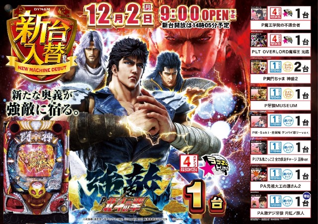 本日12月2日(月) 新台入替 9時開店(予定)