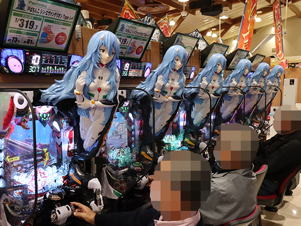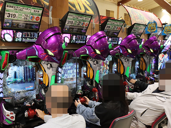 15時半ごろの100円/86玉パチンコを見てみると、「新世紀エヴァンゲリオン〜未来への咆哮〜」や「ぱちんこ シン・エヴァンゲリオン Type レイ」などのエヴァシリーズが大盛り上がり。魅力的なシーンをシマのあちこちで目にしている。