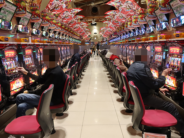 機種構成が魅力的な1000円/46枚パチスロを見ると、ほぼ満席となるほどの支持を得ていた。
