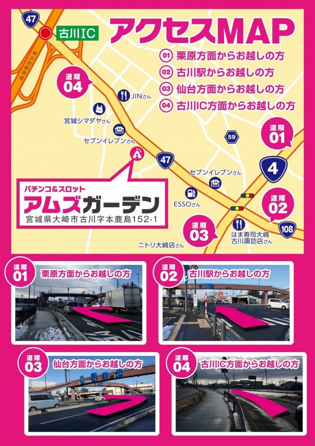 ROUTE01>古川インターを降りて古川方面へ300m、ROUTE02>古川駅から車で約5分 |