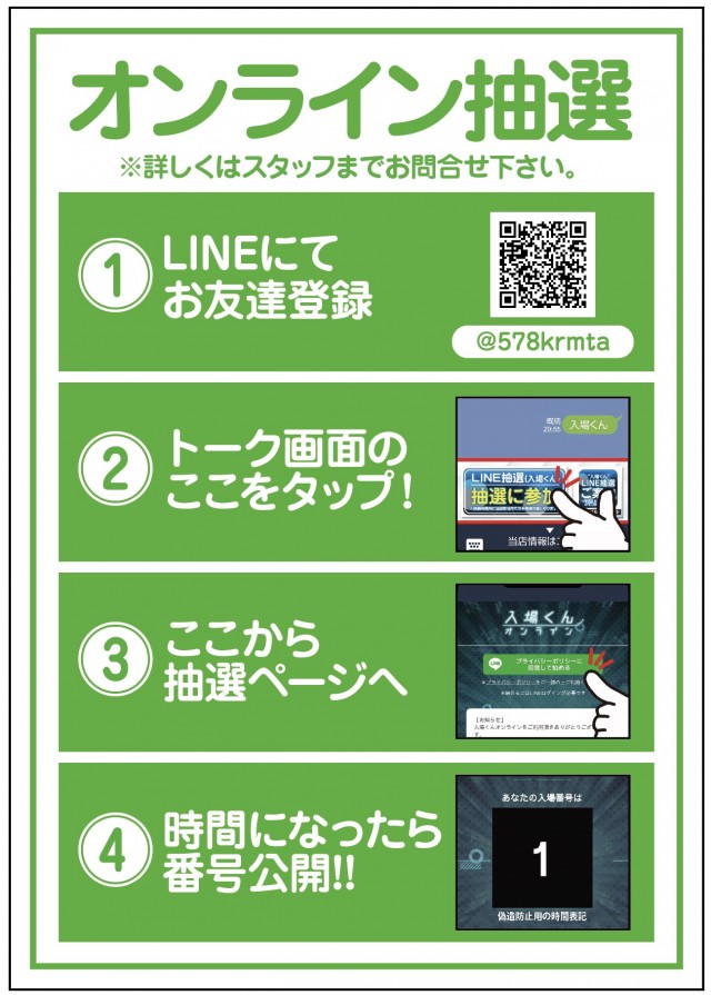混雑が予想される場合はLINE抽選とさせていただきます。 |