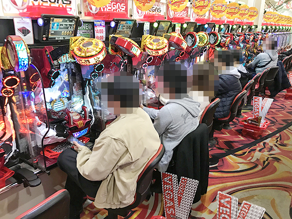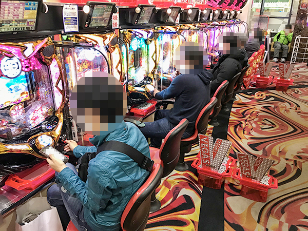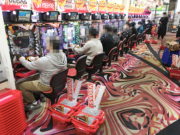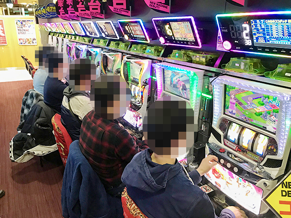取材時は既に多くのプレイヤーが集結し、パチンコ・パチスロを問わずにぎやかな状況となっていた。