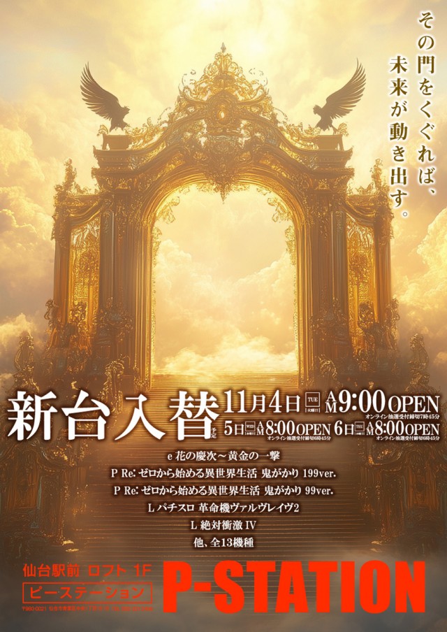 明日11月4日(火)<新台入替> 9時OPEN予定!