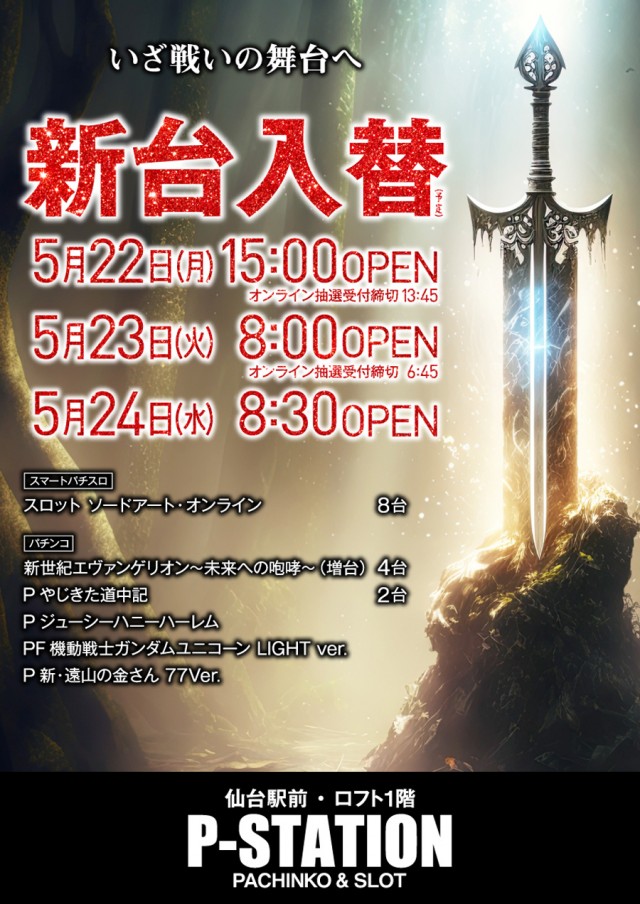 ★★本日5月22日(月)新台入替15時OPEN予定!★★