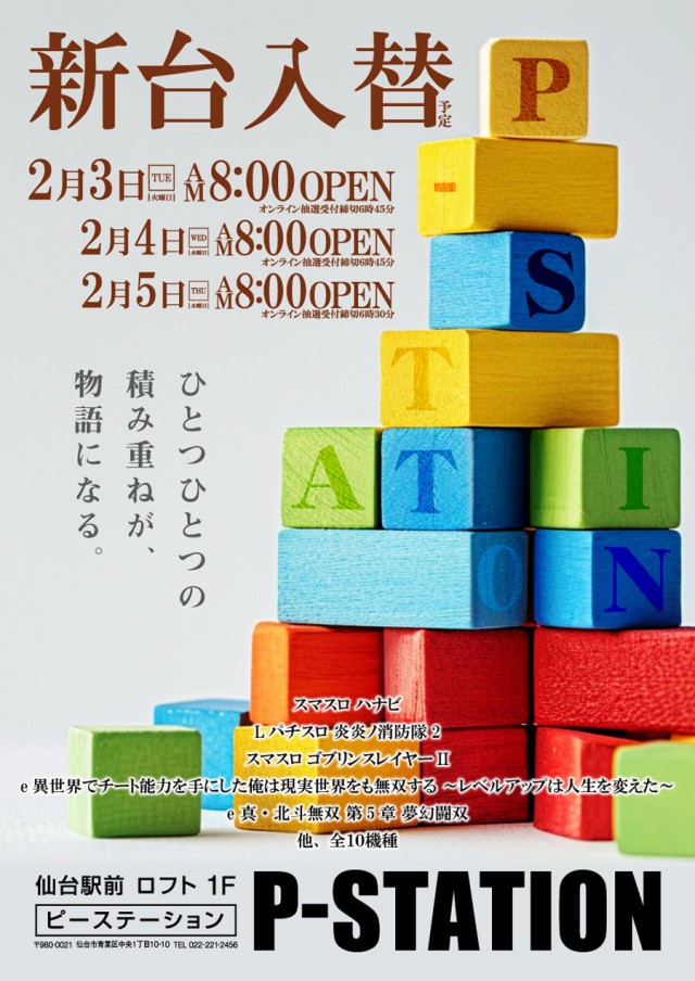 明日2月3日(火)<新台入替> 8時OPEN予定!