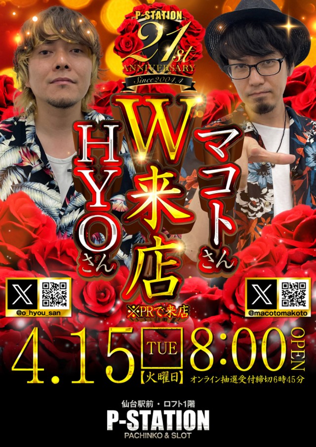 明日4月15日 【W来店】HYOさん&マコトさん