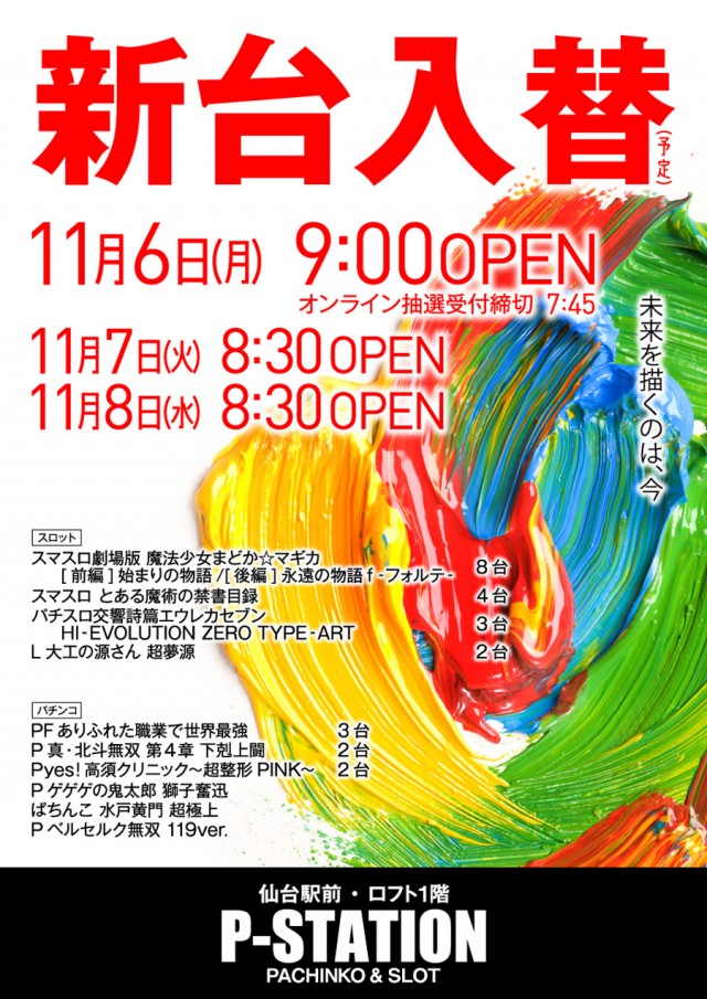 ★★明日11月6日(月)新台入替9時OPEN予定!★★